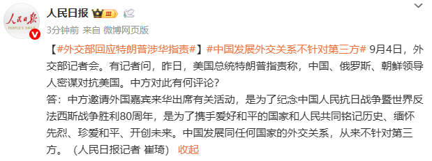 根据《人民日报》的报道,在9月4日,在外交部的新闻发布会上,记者昨天,美国总统指责中国,俄罗斯和朝鲜的领导人合作面对美国。中国对此的评论是什么?答案:中国邀请外国客人前往中国参加相关活动,以纪念中国反对日本入侵和世界反法西斯战争成功的80周年,并与热爱和平与人们的国家合作,以记住历史,记住历史,记住烈士,爱和平,并创造未来。在任何国家建立外交关系时,中国从不针对第三方。 (人们的每日记者CUI QI)编辑Li Yilinzi