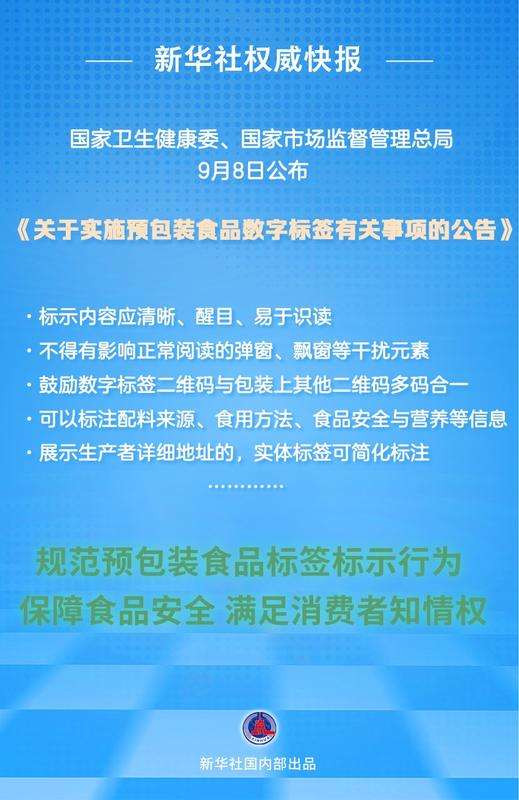 据新华社报道,国家卫生委员会和国家法规政府于9月8日发布了“关于实施预包装食品的数字标签的公告”。该公告指出,数字标签是数字技术实体显示的相关信息,其内容应遵守中国人民共和国的第67条和国民食品安全性食品的prepact of-pred-pred-prep-prepack prep-prepack of-prep-prep-prep-prep-prep-prep-prep-prep-prep-prep-prep-prep-prep-prep-prep-prep-prep-prep-prep-prepack prep-prepack prep-prepack prep-prepack。基于“国家食品安全标准预包装食品标签的一般规则”(GB 7718-2025)于今年3月发布,该公告进一步完善了应用数字标签的应用要求,包括应该清晰,明显且易于阅读的标签内容;不应中断弹出式窗口和凸窗,影响正常读取的元素;鼓励将数字标签包括在Packagin的其他QR码中g以实现多代码集成;可以标记成分,食用方法,食品安全和营养等信息;如果食品数字标签显示制造商的详细地址,则可以简化物理标签。近年来,国家卫生委员会及相关部门一直努力支持食品标签管理。目前,建立了一个相对完整的食品标签标签系统,该系统在标准化我国已包装食品的标签行为方面起着重要作用,从而确保了消费者知道的食品安全和令人满意的权利。公告的原始文本:国家卫生委员会和国家政府对市场法规的公告,用于预先包装食品的数字标签Mao Tianyu