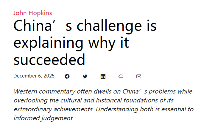 文章认为,西方媒体报道了中国的许多问题,许多专家也靠分析和讨论这些问题谋生。中国面临的挑战是:中国如何理解过去50年世界取得的非凡成就?